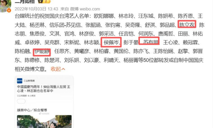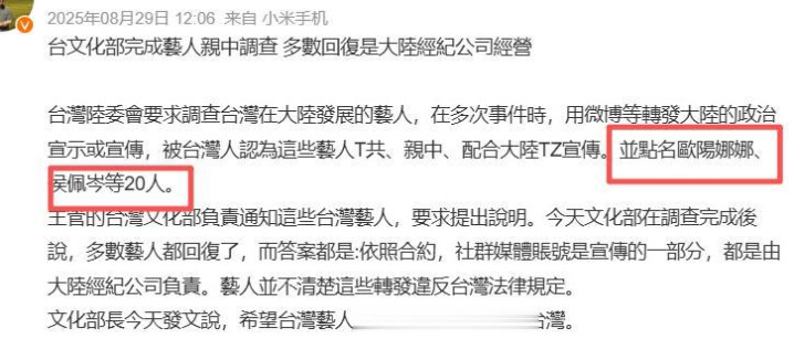 每次有转发任务的时代,他们王人会被夸一次,像欧阳娜娜、侯佩岑不仅每次转发王人不缺席,之前还被台文化部点名探听了,王人莫得靡烂。