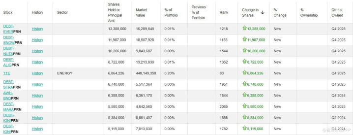 从头建仓情况来看,花旗在第四季度新增了多项债务类及可调节证券联系合手仓。其中,新纳入的看法包括西星动力(EVRG.US)、Snowflake(SNOW.US)、Nutanix(NTNX.US)、艾利科技(ALGN.US)、MaraHoldings(MARA.US)、IonQInc(IONQ.US)等公司的联系债务或优先证券,单一看法新增限度多半在约莫500万至1300万份区间,全体占投资组合比例相对有限。